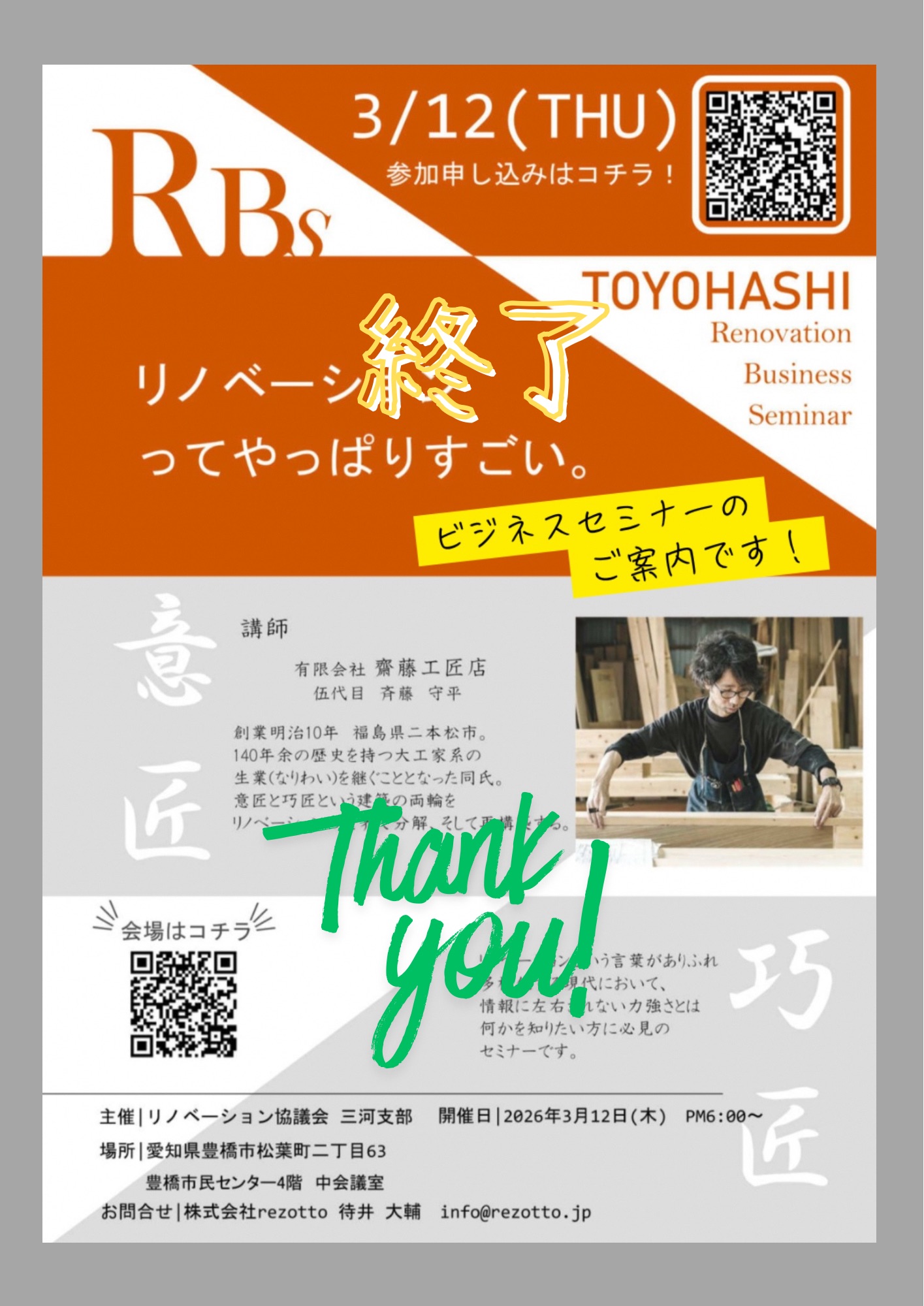 リノベーション協議会三河支部では年に数回リノベーションビジネスセミナーを開催しています。ご興味のある方は今後の活動も是非CHECKして下さい。